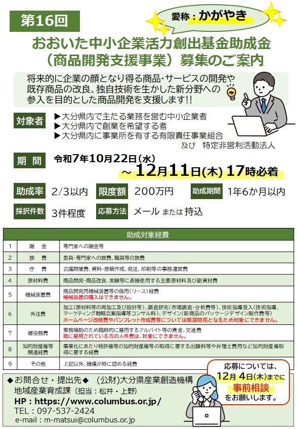 【募集:助成金】<愛称:かがやき>第16回おおいた中小企業活力創出基金助成金(商品開発支援事業)募集のご案内