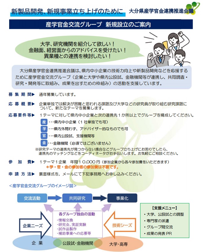 大分県産学官金連携推進会議は、県内中小企業の技術力向上や新製品開発などを応援するために産学官金交流グループ(企業と大学や県内公設試、金融機関等が連携し、共同調査・研究・開発等に取組み、成果を出すための枠組み)の活動を支援しています。